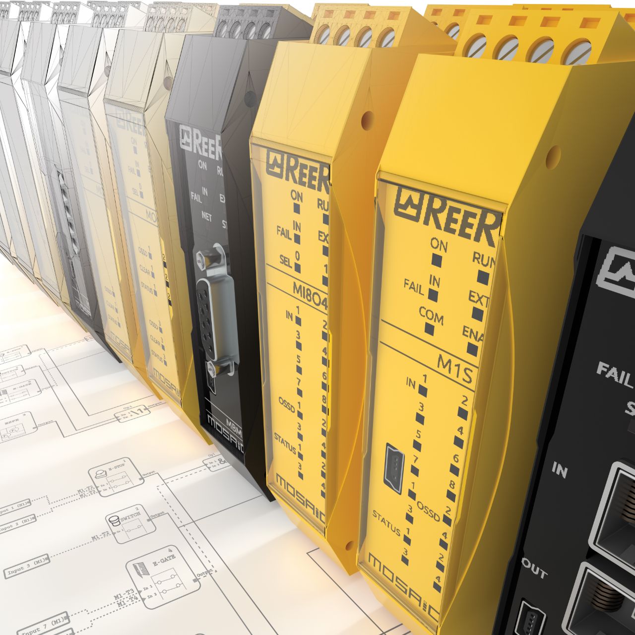 ReeR's Mosaic series includes programmable safety controllers that offer flexibility and scalability. Master units, such as the M1, M1S, and M1S COM, support up to 16 inputs and 8 OSSD outputs, with Fieldbus communication capabilities and compliance with SIL 3 and PL e standards. Expansion units, like the MV (speed monitoring), MA (analog inputs), and MR (safety relay units), allow customization of the system to meet specific application requirements.
